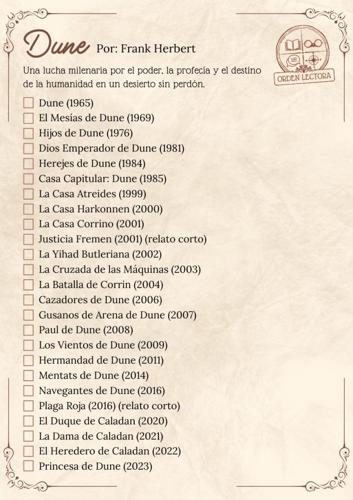 El orden más recomendado es el orden de publicación, ya que respeta la visión original de Frank Herbert y permite seguir el desarrollo natural de la historia. Empieza con Dune (1965) y continúa con los cinco libros siguientes del autor. Después, si te quedas con ganas de más, puedes leer las secuelas escritas por su hijo Brian Herbert y Kevin J. Anderson, basadas en notas del autor original.